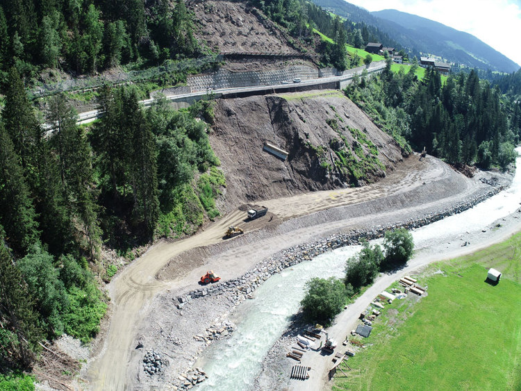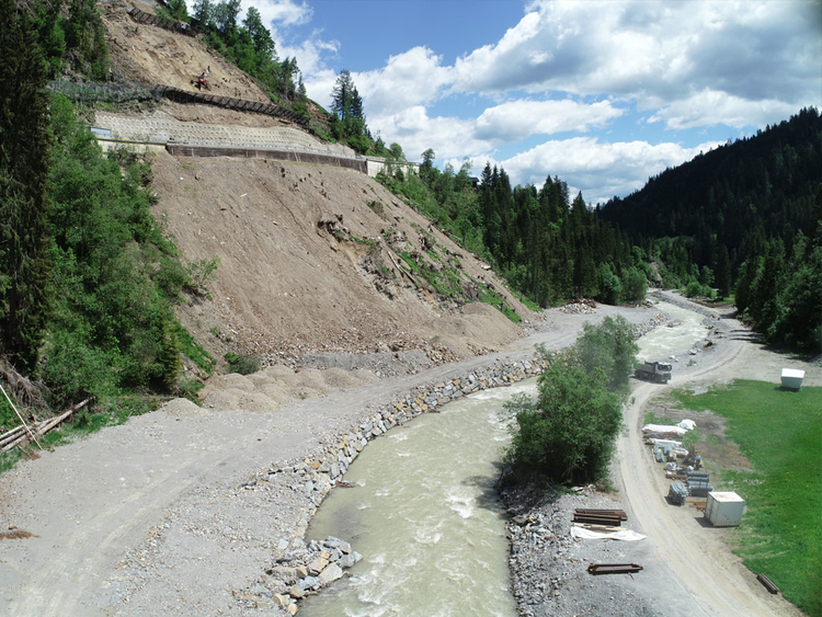 Als eine der Ursachen für die abgelaufene Rutschung wurde ein Unterschneiden des Hanges durch die talseitige Gail identifiziert. Um den Gailverlauf vom Prallhang wegzurücken und den Rutschköper zu stabilisieren wird als Sicherungsmaßnahme ein neuer Leitdamm in der Gail errichtet.